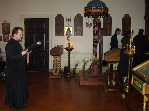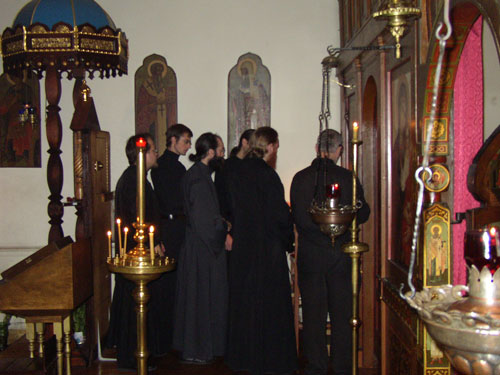 On the following morning, Saturday, October 25, the group of seminarians assembled for the Divine Liturgy at the St. Sergius Chapel in the Synod headquarters, celebrated by the V. Rev. Archpriest George Kallaur. The seminarians formed an impromptu choir under the direction of fourth-year student Daniel Millwood, and Deacon Vladimir read the appointed Epistle readings. Following the completion of the Divine Liturgy, Fr. George offered warm words of welcome and gratitude to the seminarians for evoking the monastery atmosphere with their inspired singing and telling the assembled faithful of Fr Vladimir's efforts in renewing the work of the Seminary.