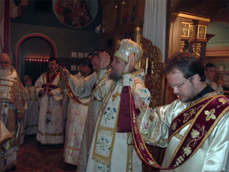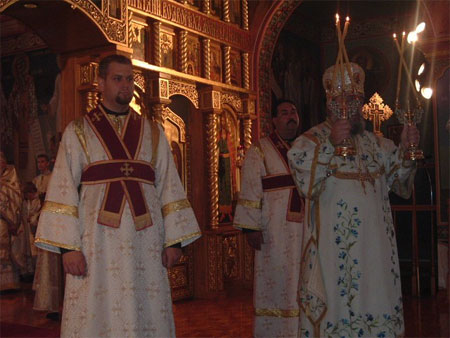 An all-male choir sang under the direction of Archpriest Serge Lukianov during All-night vigil, while during the Hierarchal Liturgy Andrei Burbelo directed the cathedral's choir. Bishop Gabriel was met before the Liturgy by the cathedral's starosta with the traditional bread and salt after which the rector Fr. Protopresbyter Valery Lukianov officially welcomed His Grace to the parish. Fr. Protopresbyter Valery Lukianov, Archpriest Serge Lukianov, Protodeacon Joseph Jarostchuk, Deacon Vladimir Tsurikov and Deacon Nicholas Lukianov all served along the side of His Grace Bishop Gabriel during Divine Liturgy. At the end of the service, Subdeacon Alexander Lukianov of St. Alexander Nevsky parish, received a hierarchal gramota for his extensive service to the Church.
