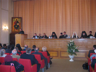 The Academy's annual "Akt," this year marking the 320th anniversary of the Moscow Theological Academy, met in the Academy's auditorium in the afternoon of October 14. The festivities began with a greeting by His Eminence, Archbishop Evgenii, and a speech by M. S. Ivanov, Academic Dean of the Academy, on the activities of the Moscow Theological Academy and Seminary in the past year, followed by a talk by Archpriest Maksim Kozlov entitled "Professors of Theology at the Moscow State University, Alumni of the Moscow Theological Academy." His Holiness, Patriarch Alexy, addressed the audience with a speech concerning the importance of theological education. A series of addresses by representatives of both ecclesiastical and secular bodies was then given, including addresses by His Eminence, Archbishop Konstantine of Tikhvin, Rector of the St. Petersburg Theological Academy, Archimandrite Leonid, Rector of the Minsk Seminary, Priest Georgii Orekhanov of the St. Tikhon's Orthodox Humanities University. Deacon Vladimir Tsurikov read a letter of His Eminence, Metropolitan Laurus, First Hierarch of the Russian Orthodox Church Abroad and Rector of Holy Trinity Seminary to His Eminence, Archbishop Evgenii, congratulating him on the Academy's anniversary.