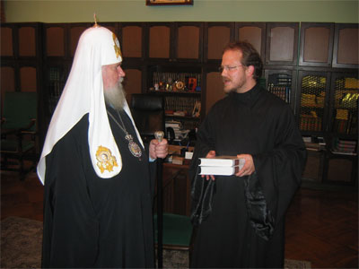 His Holiness, Patriarch Alexy II of Moscow and All Russia, presided at the Divine Liturgy in the Moscow Theological Academy's Church of the Protection of the Theotokos on October 14, the feast-day of the church. Following a festive meal, His Holiness, Patriarch Alexy II, held a private audience with Deacon Vladmir Tsurikov in the company of His Eminence, Archbishop Evgenii, during which His Holiness expressed his approval of the cooperative efforts between the Moscow and Jordanville Seminaries.