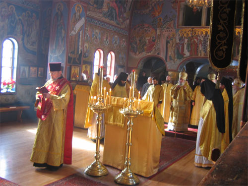 On February 11-12, 2007, the seminarians and faculty of Holy Trinity Seminary together with the brotherhood of Holy Trinity Monastery celebrated the feast of the Three Hierarchs, Sts. Basil the Great, Gregory the Theologian, and John Chrysostom, the heavenly protectors of the Seminary. The festive services were presided over by His Eminence, Metropolitan Laurus, First Hierarch of the Russian Orthodox Church Abroad and Rector of Holy Trinity Seminary. His Grace, Bishop Peter of Cleveland, alumnus of the Seminary, arrived on Saturday to join the celebration. During the Vigil, as well as during Divine Liturgy large parts of the services were read and chanted in Greek, including the reading of the festive canon, the Epistle and Gospel. Second year seminarian Sergio Silva, a native of Brazil, was tonsured to the rank of reader during the hours. During the Small Entrance at the Liturgy, Metropolitan Laurus awarded Hieromonk Theophylact (ClapperDeWell), Dean of Students, the right to wear the nabedrenik in recognition of his many labors, which include responsibilities as Registrar of the Seminary and bookkeeper. The same ecclesiastical award was presented to hieromonk Dionisy (Dmitrievich), a second year seminarian. Following the Divine Liturgy a moleben was served to the Three Hierarchs.