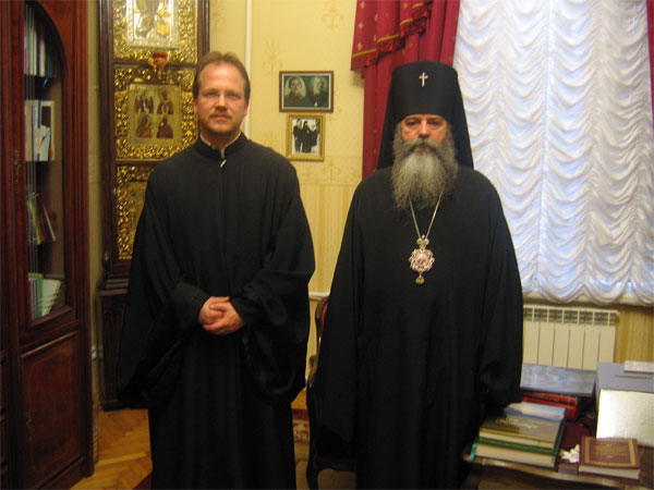 On April 10, 2007, Deacon Vladimir Tsurikov, Assistant Dean of Holy Trinity Seminary visited the St. Petersburg Theological Academy, where he met with His Grace Archbishop Constantine, rector of the St. Petersburg Theological Academy and Seminary. The meeting was dedicated to a discussion of possibilities of cooperation and joint educational projects between the two institutions, as part of a recently signed agreement between the Educational Commission of the Russian Orthodox Church and Holy Trinity Seminary. A second meeting has been scheduled for July of this year. After the meeting, which lasted several hours, Archbishop Constantine invited Deacon Vladimir to join the hierarch in visiting the Academic Capella of St. Petersburg to attend festivities of the 15 th annual Paschal Festival, this year dedicated to the Ostromirovo Gospel.