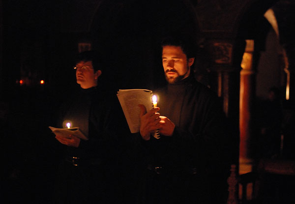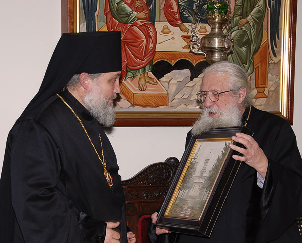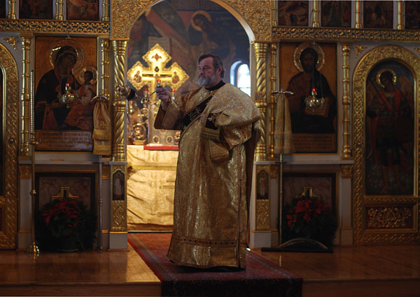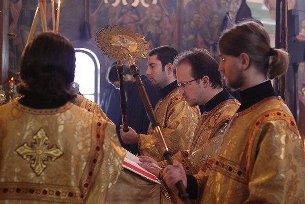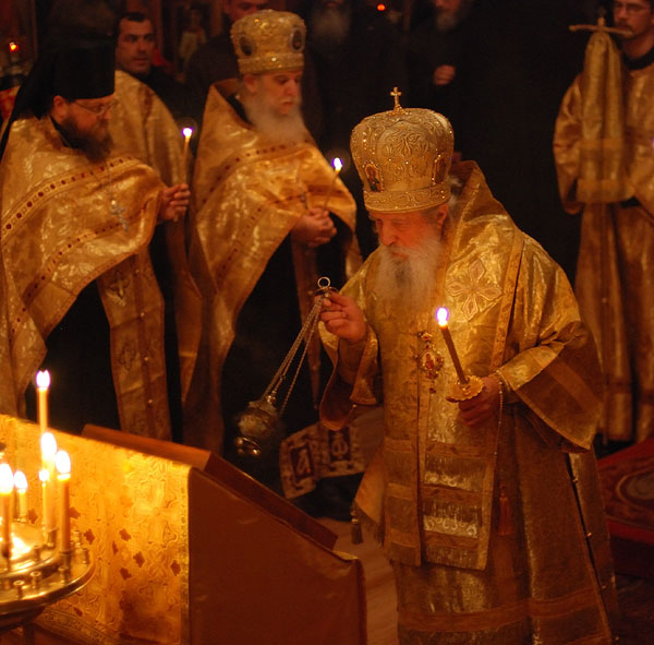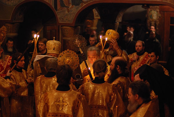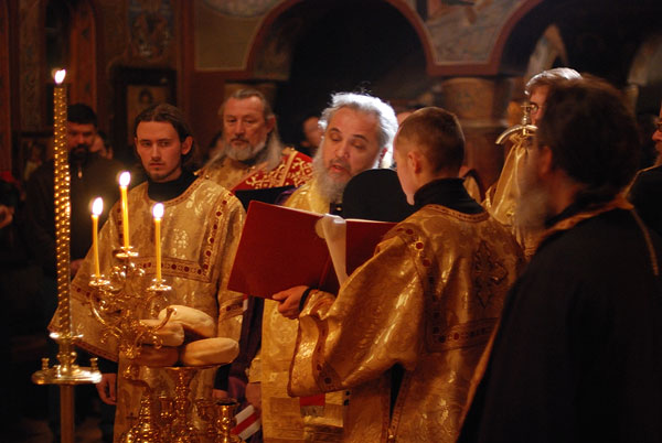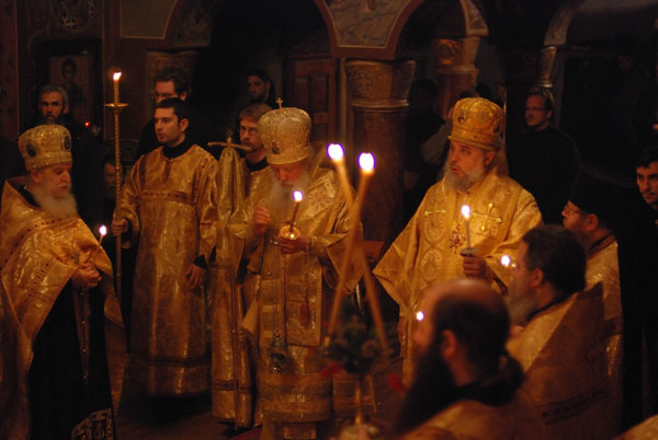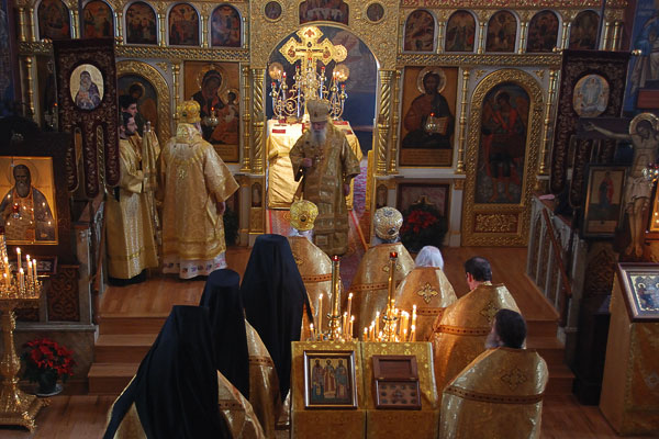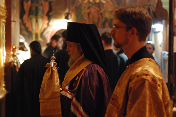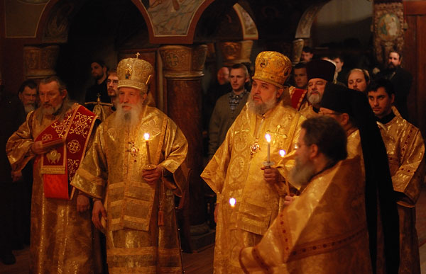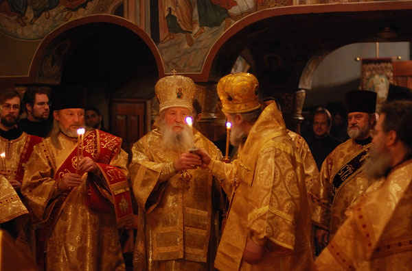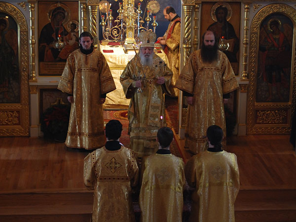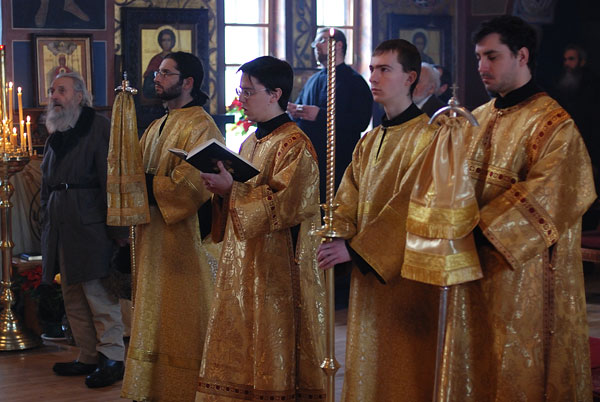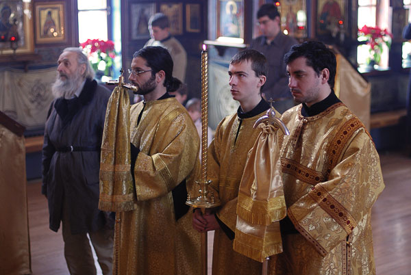 On February 11-12, 2008, the seminarians and faculty of Holy Trinity Seminary together with the brotherhood of Holy Trinity Monastery celebrated the feast of the Three Hierarchs, Sts. Basil the Great, Gregory the Theologian, and John Chrysostom, the heavenly protectors of the Seminary. The festive services were presided over by His Eminence, Metropolitan Laurus, First Hierarch of the Russian Orthodox Church Abroad and Rector of Holy Trinity Seminary. His Grace, Bishop Gabriel of Manhattan, alumnus of the Holy Trinity Seminary, was present to join the celebrations. During the Vigil, as well as during Divine Liturgy, large parts of the services were read and chanted in Greek, including the reading of the festive canon, the Epistle and Gospel. Following the Divine Liturgy a moleben was served to the Three Hierarchs.
