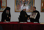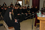 In conclusion, Archimandrite Luke expressed his gratitude to Metropolitan Hilarion for his inspiring spiritual patronage, and presented him with a painting of the monastery’s St. John of Kronstadt chapel on behalf of Holy Trinity Seminary. In recognition of Riassophore-monk Vsevolod’s long years of service to the Seminary, and in memory of his time spent at HTS, a painting of the monastery chapel was presented to him as a farewell gift, as Fr. Vsevolod will be returning to Russia to continue his monastic path under the guidance of his spiritual father.