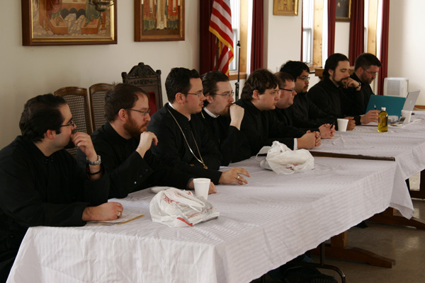 After lunch, the executive board met and composed an agenda. Then the general assembly met and discussed current business, including upcoming events such as a spiritual retreat and the fall 2009 meeting. The last item of business was the election of a new president, who serves for one year. Ephraim Willmarth of Holy Trinity Seminary was re-elected to that position. Joseph Gingrich of Christ the Savior Seminary was elected vice-president. Paul Truebenbach of Holy Cross School of Theology was elected secretary.