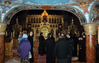 After breakfast, the students began a tour of Holy Trinity Monastery and seminary, including the print shop, and icon studio, and Holy Trinity Cathedral. Archimandrite Luke (Murianka), Rector of Holy Trinity Seminary, addressed the students offering some thoughts on pastoral responsibilities. Afterwards, all were anointed with myrrh from the newly revealed myrrh-streaming icon of the Theotokos “Softening of Evil Hearts”. Hieromonk Roman and Ryassophore-monk Benjamin spoke about some of the monks of Holy Trinity Monastery of blessed memory, especially Archimandrite Cyprian.