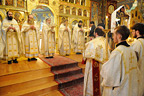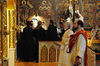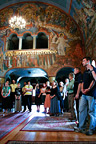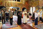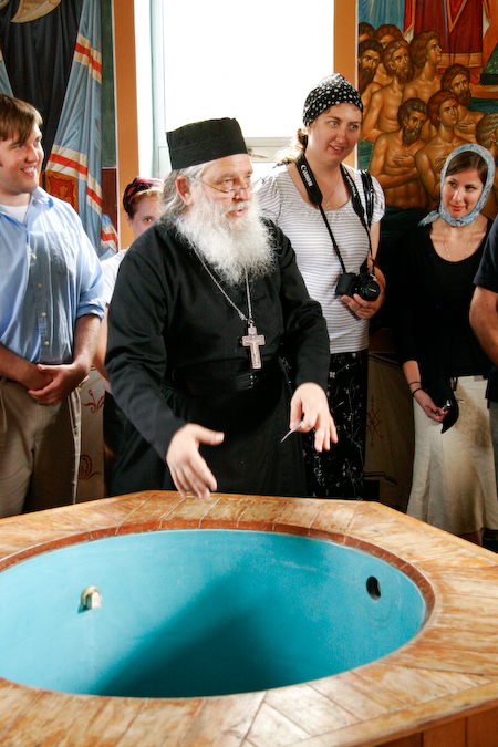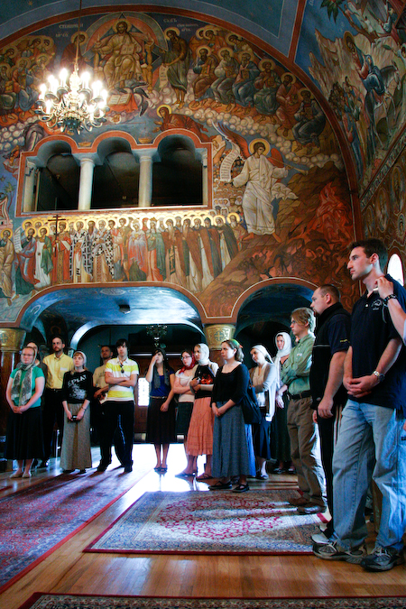After a short break, Archimandrite Luke (Murianka) gave a tour of some of the buildings on the Monastery grounds, including Holy Trinity Cathedral, the baptistery, and the monastery print shop. He spoke about the meaning of the church icons, the history of Holy Trinity Monastery, and shared his thoughts on its historical and current mission. Afterward, the group went to the cemetery church to read the rule for Holy Communion, which was done partly in Slavonic and partly in English. The group enjoyed supper in the Monastery refectory with the monks, and then attended the all-night vigil. Some of the participants sang in the choir with the monks and seminarians, while others stood and prayed for the entire service.