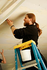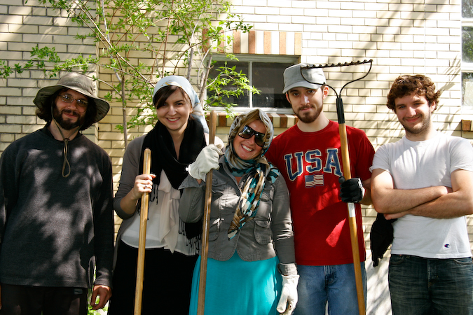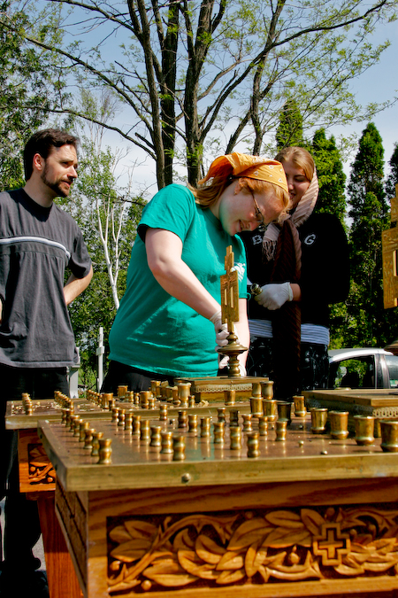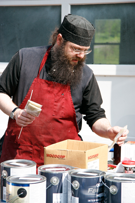 Then the group broke up into three randomly chosen groups who helped to beautify the monastery. One cleaned the cemetery church dedicated to the Dormition of the Mother of God. Another helped to clean, paint, and prepare the garage building to be a nice dining hall for the pilgrims who will be coming for the monastery’s feast day, on Pentecost. The third helped to beautify the monastery grounds by weeding, trimming, and spreading decorative mulch.