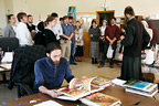 The next morning after liturgy and breakfast, the group attended a spiritual talk on Orthodox Spirituality with comments on monasticism and marriage by Hieromonk Cyprian (Alexandrou), the Holy Trinity Seminary Dean of Students and also Instructor of New Testament Greek. After the talk, the participants went on a tour of the icon studio given by iconographer and monk Theophan. Then they toured the museum, guided by Michael Perekrestov. This officially concluded the Memorial Day Weekend retreat. Many voiced the hope that this will become an annual event.
