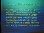 He linked the origin of Orthodoxy with American colonization, noting that there were Greek Christians even among the first Spanish explorers. He also explored in depth the first certifiable Orthodox convert in America, Philip Ludwell III, whose descendants may have kept the Orthodox faith for over two centuries. Chapman, who also manages the publication and bookstore operations for the Monastery, has published his findings in a special issue of the journal Road to Emmaus.