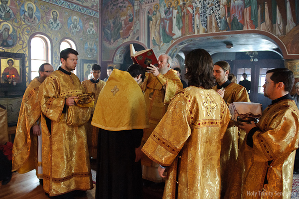 His Grace Bishop Jerome also served the Divine Liturgy the following morning. During the reading of the Sixth Hour, fifth-year seminarian Ephraim Willmarth was tonsured a reader by Bishop Jerome. The liturgy was followed by a festive meal in the brotherhood trapeza. At the end of liturgy, Bishop Jerome gave a homily encouraging the remembrance of teachers both past and present. He called to mind his previous teachers of blessed memory: Archbishop Averky (Taushev), Bishop Nikon.