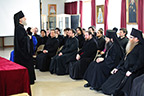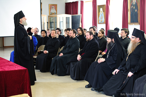 After the meal, there was a ceremony in the Seminary Hall, with tea, coffee, and sweets prepared by the fourth-year seminarians. His Grace Bishop Jerome gave an address in Russian about the legacy of Metropolitan Anthony Khrapovitsky of Kiev, the founding First Hierarch of the Russian Orthodox Church Abroad. Archpriest Vladimir von Tsurikov, the Dean of Holy Trinity Seminary, then announced the students chosen to receive academic grants. From the first year: Jason Laiblin, John Martin, and David Mahand; and 2nd year seminarian Roman Kunen. From the third year: Vladimir Gayfudinov, Sergei Grushchin, and Anthony Williams. From the fourth year: Dimitrii Anopochkin and Sergei Tuigin. From the fifth year: Maksim Abroskin, Dimitrii Bolbot, and Ephraim Willmarth.