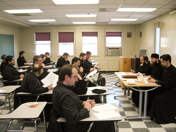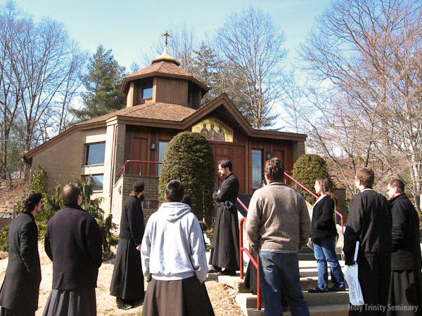 On February 25-26, students representing Holy Trinity Seminary attended the Spring meeting of the Orthodox Inter-Seminary Movement (OISM), held at St. Vladimir's Theological Seminary in Crestwood, New York. The group, consisting of Ephraim Willmarth, Feliks Lubnin, David Mahand, John Martin, and Srdjan Puskar, met with seminarians from six other Orthodox seminaries: St. Vladimir's, St, Tikhon's, St. Herman's (OCA), Holy Cross (GOA), St. Sophia's (Ukrainian), and Christ the Savior (Carpatho-Russian). After arriving at the seminary on Friday evening, the HTS contingent had dinner with their fellow seminarians, and socialized in the dormitory common room.