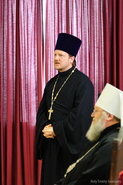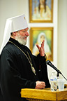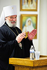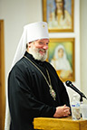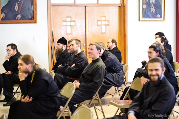 Everyone gathered in the brotherhood refectory for a nice lunch and afterwards met in the Seminary Hall for a talk with Metropolitan Christopher. Metropolitan Christopher showed a very interesting film about the history of Orthodoxy in the Czech Republic and Slovakia, beginning from the missionary work done there by Saints Cyril and Methodius. Afterwards, he answered questions from those gathered.