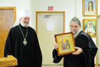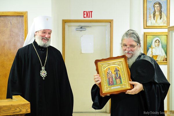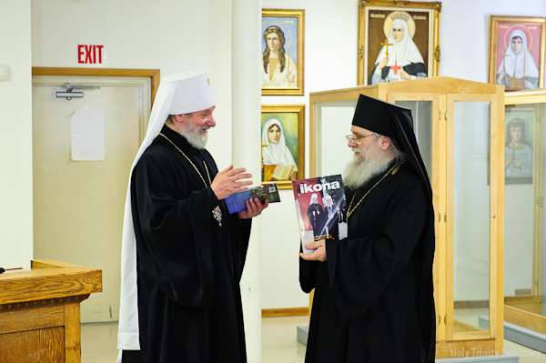 At the end of the meeting, Metropolitan Christopher presented the monastery a gift of an icon of Saints Cyril and Methodius, which had been blessed at places in Moravia where the saints had carried out their missionary endeavors. Archimandrite Luke, in memory of Metropolitan Christopher’s visit, gave him a present of an icon of the Three Holy Hierarchs: Basil the Great, Gregory the Theologian and John Chrysostom, the protectors of the Holy Trinity Seminary; a beautiful prayer rope made by one of the seminarians, and some monastery publications.