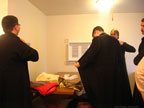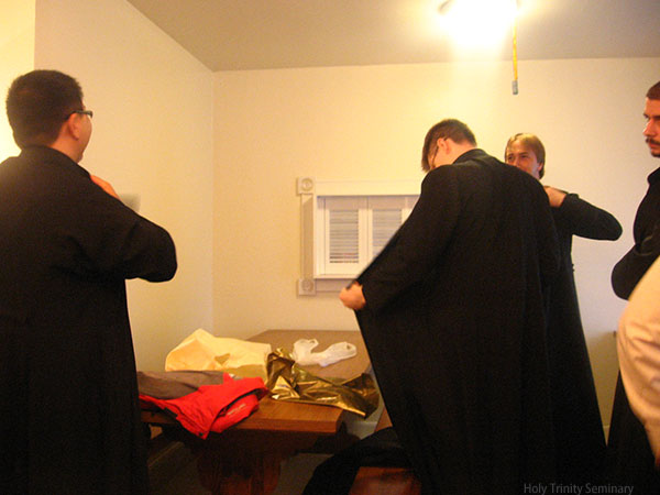 After breakfast, students met with seminary administration for orientation. Father Luke welcomed the students and gave some words of advice. He stressed the importance of asking oneself, ”Why am I here?” and of treating each day of one’s seminary career as the first. He then blessed new students to wear their cassocks.