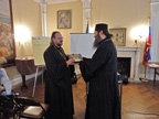 During lunch, the symposium participants sang “Save, O Christ God” in honor of Fr Cyprian’s namesday (Hieromartyr Cyprian). At the close of the symposium, Fr Andrei Sommer, head of the Synodal Youth Department, presented Fr Cyprian with a book on the Kursk-Root Icon for his participation in the event.
