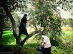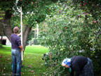 Students collected apples from the monastery's apple trees with staves and baskets. The collected apples filled over twenty boxes. Srdjan Puskar, a second-year student, took a direct approach. He climbed one of the trees and shook it vigorously. The quivering tree let loose a flurry of apples.