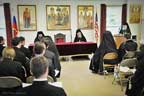 Archimandrite Luke, the Rector and Acting Dean, gave an opening address in Russian encouraging the graduating students to continue their progress in learning: “Never forget your books. Continue always to find the time to further your knowledge…Quench not the Spirit!” The commencement address was given by Archimandrite Meletios (Webber). Fr. Meletios is the abbot of St. John of San Francisco Orthodox Monastery (OCA) in Manton, California. Fr. Meletios gave an engrossing talk on asceticism and its absolute necessity in spiritual life, for future pastors and all Orthodox Christians. He called upon the audience to look upon asceticism in a positive sense, as “training the body for glory.”