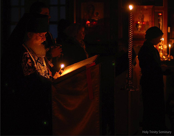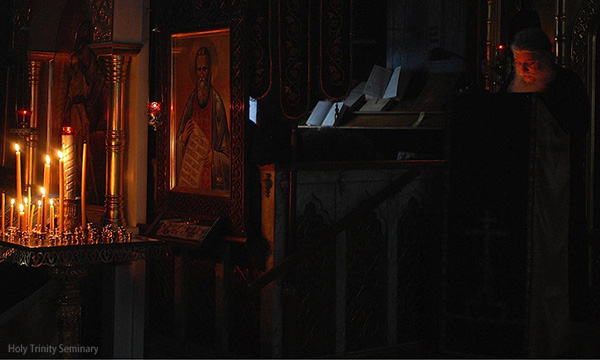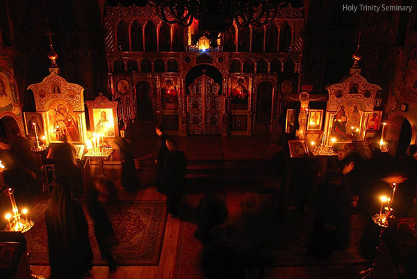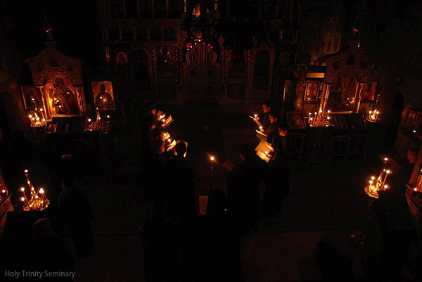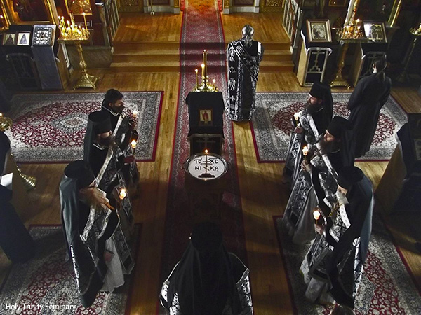 The First Week of Great Lent is kept with particular reverence and dedication in Holy Trinity Monastery. Classes are not held all week so that seminarians may attend the full cycle of services. Few places, and even few monasteries keep such a rigorous rule. Beginning with Midnight office at 5am, Matins, First Hour, and a Litya for the reposed follow, with no abbreviations. A short break is followed by Third, Sixth and Ninth Hours, Typica, and Vespers (on Wednesday and Friday combined with Presanctified Liturgy). The Psalter is read in full twice through the week. The readings, including the Ascetical Homilies of St. Ephraim the Syrian, Palladius, The Synaxarion, and The Ladder of Divine Ascent are interspersed throughout the services in their appointed places. There is so much rich hymnography concerning the meaning of the fast, so much ascetical instruction for those who thirst for God, that an illiterate man could learn everything he needed to know simply by standing in Church. A seminarian can learn this and more. He absorbs the order of the services and begins to ascertain the harmony of their construction.