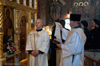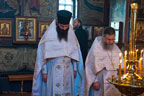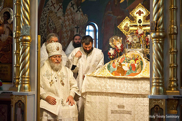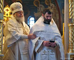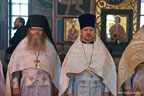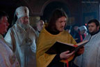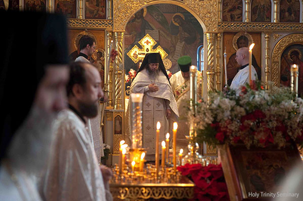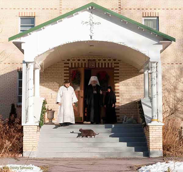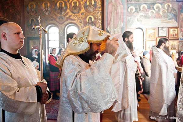On December 27, 2011/January 9, 2012, Holy Trinity Monastery and Seminary celebrated the Third Day of the Nativity of our Lord. Metropolitan Hilarion (Kapral) officiated the Divine Liturgy. Most of the clergy and servers were HTS graduates, including Archpriest Vsevolod Drobit, Hieromonk Seraphim (Baltic), Archpriest Michael Taratuchin, Priest Pavel Ivanov, Archdeacon Joesph Jarostchuk, Archdeacon Victor Lochmatow, and Deacon Andrei Psarev. During the Hours, Fifth-Year seminarian Sergiy Tuygin was tonsured a reader. Later, three priests (also graduates of HTS) received the award of the Palitsa: Hieromonk Roman, Professor of Liturgics, Director of Right Kliros and Monastery Prosfora Baker; Hieromonk Theophylact, Professor of Biblical Archaeology and the monastery’s bookkeeper; and Archpriest Vladimir Tsurikov, Curator of Library, Museum, and Archives of Holy Trinity Seminary.