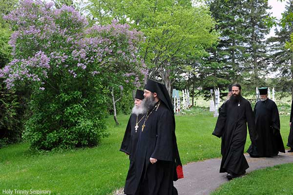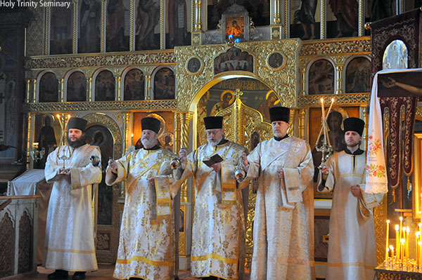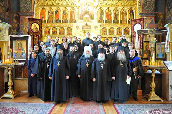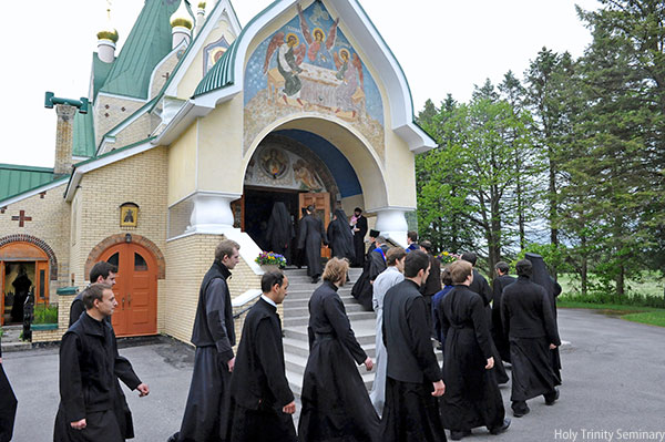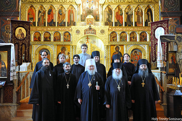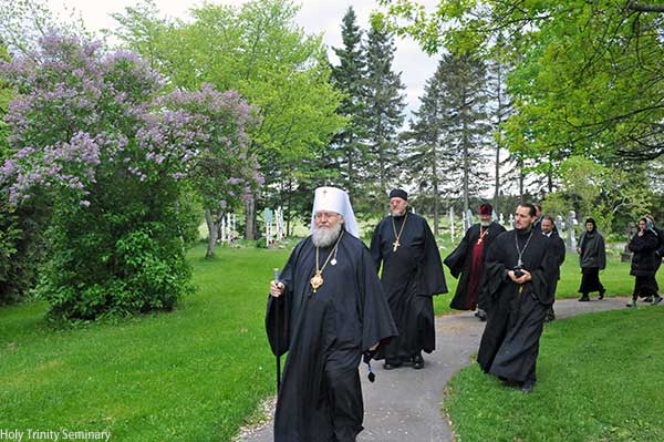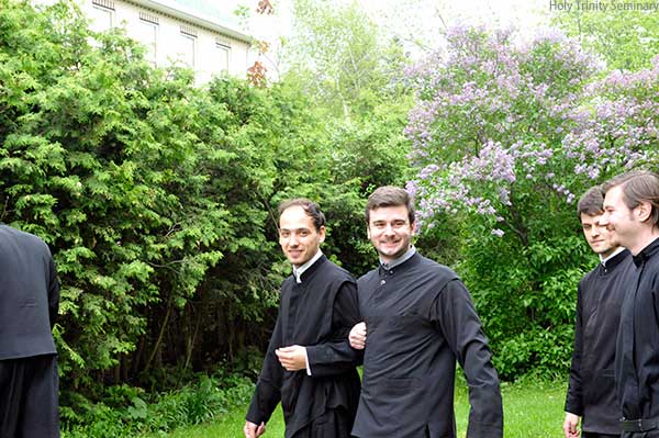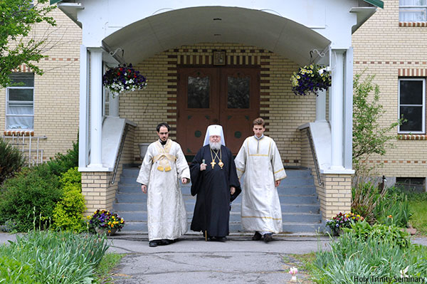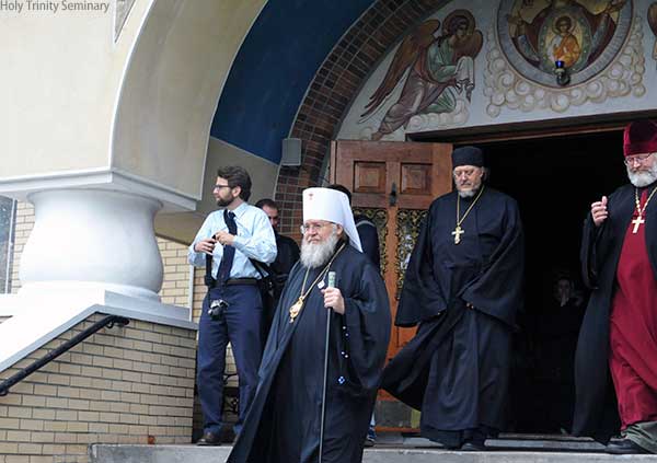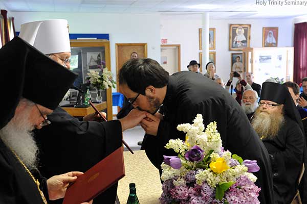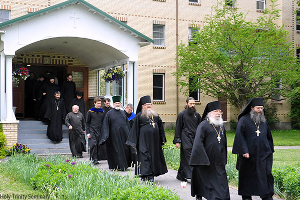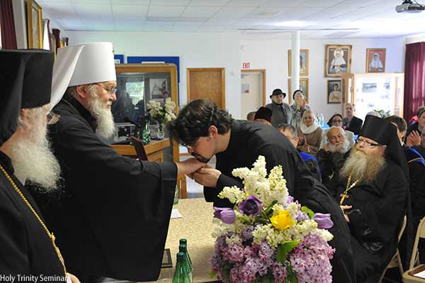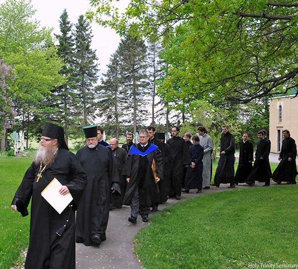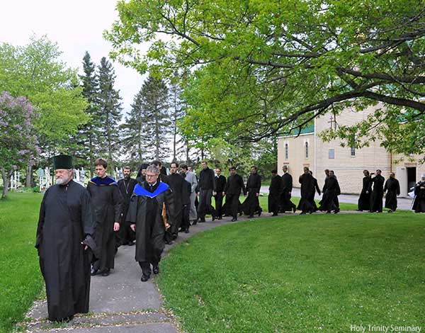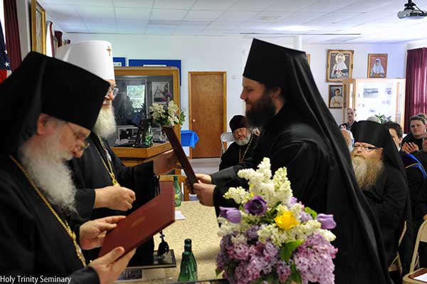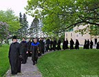 The Commencement was preceded by the All-night Vigil and Divine Liturgy, which were officiated by His Eminence, Metropolitan Hilarion of Eastern America and New York, First Hierarch of the Russian Orthodox Church Outside Russia. This year, Bachelor Candidate Peter Markevich was ordained to the diaconate during the Divine Liturgy. We exclaim with all: Axios! At 2:00pm on Sunday, all seminarians including candidates for the Bachelor of Theology gathered outside the Monastery Trapeza for a procession to Holy Trinity Cathedral, singing «Christ is Risen” all the way. A thanksgiving molebin was served, followed by a group picture, and the procession to the Seminary Hall.