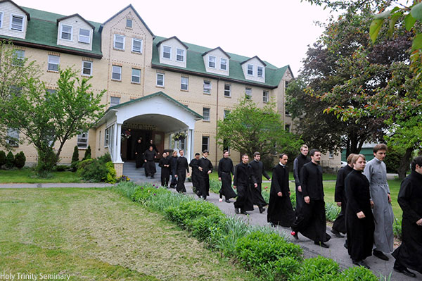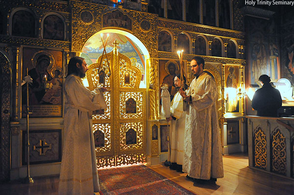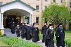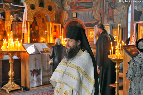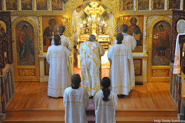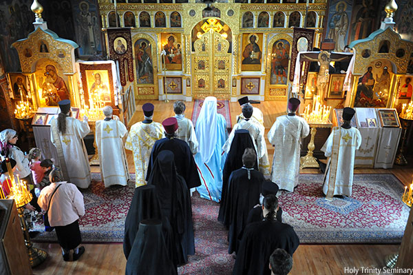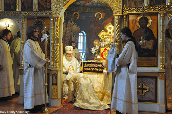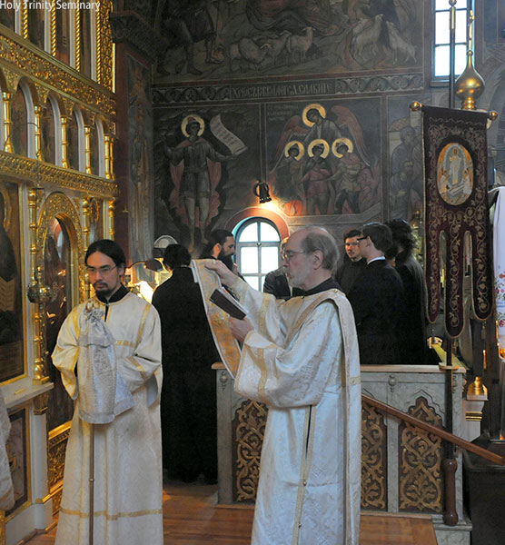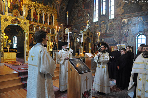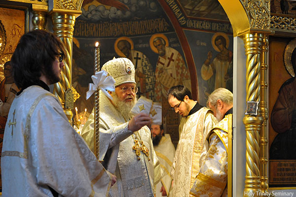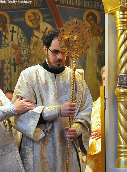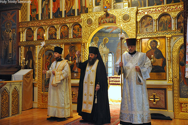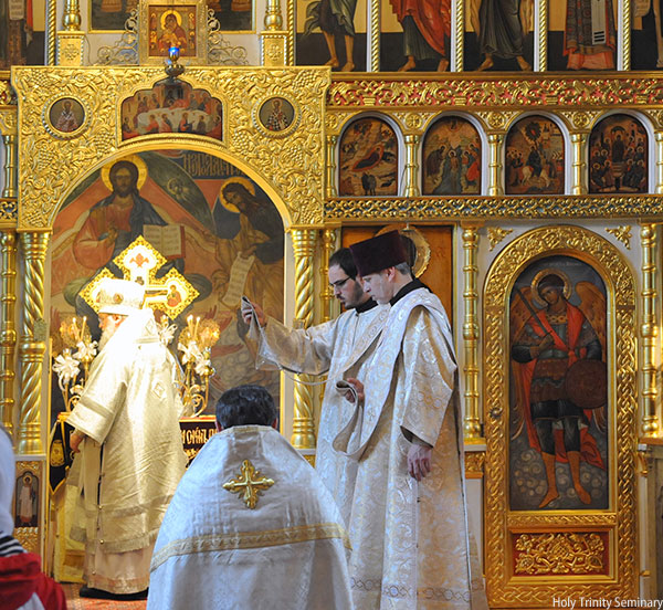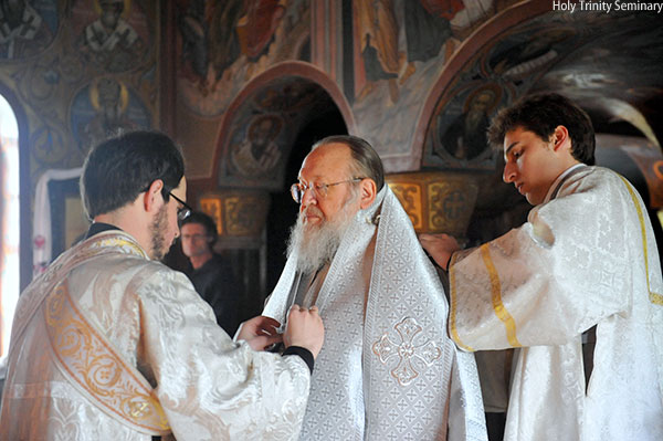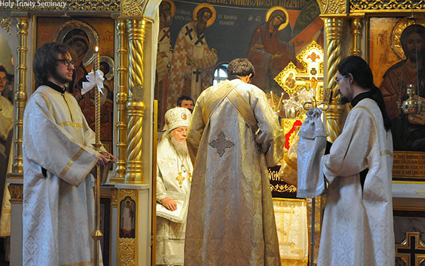 The Commencement was preceded by the All-night Vigil and Divine Liturgy, which were officiated by His Eminence, Metropolitan Hilarion of Eastern America and New York, First Hierarch of the Russian Orthodox Church Outside Russia. This year, Bachelor Candidate Peter Markevich was ordained to the diaconate during the Divine Liturgy. We exclaim with all: Axios! At 2:00pm on Sunday, all seminarians including candidates for the Bachelor of Theology gathered outside the Monastery Trapeza for a procession to Holy Trinity Cathedral, singing «Christ is Risen” all the way. A thanksgiving molebin was served, followed by a group picture, and the procession to the Seminary Hall.