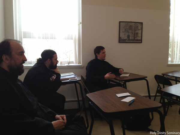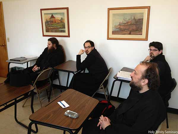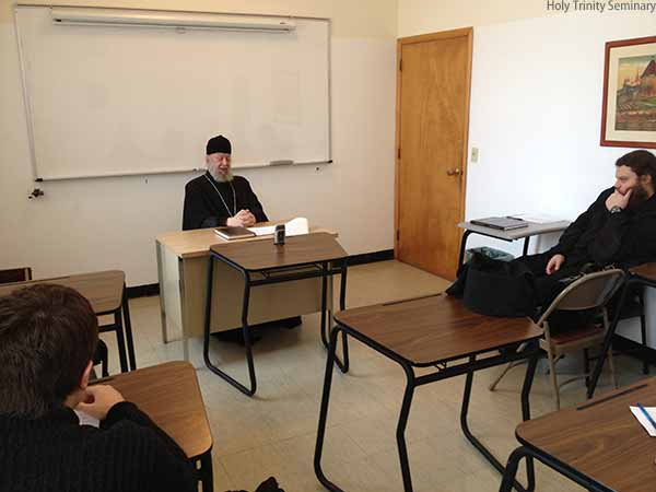 On Monday, March 24, His Grace Bishop Jerome of Manhattan met with instructors and students of Holy Trinity Orthodox Seminary in Jordanville. The meeting took place within the coursework of Canon Law, the subject that strongly demands guidance from an Orthodox bishop. Bishop Jerome, who has many years of pastoral experience, commented on a number of complex issues related to the field of ecclesiastical law.